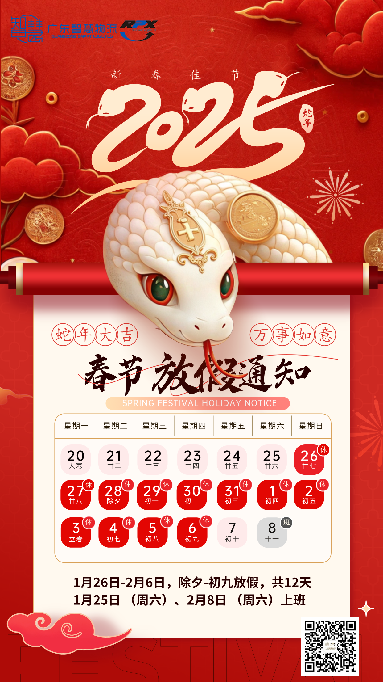 尊敬的各位客户、供应商:正值中国的传统节日”春节“来临,在此向各位客户、供应商拜个早年!预祝大家新春愉快!财源广进!经我司领导研究决定,2025年春节安排如下: