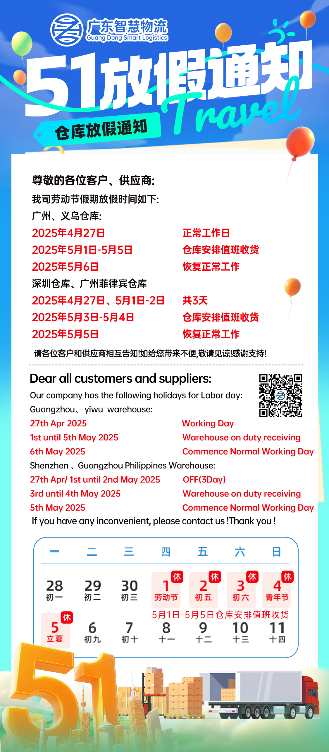 尊敬的各位客户、供应商:正值中国的传统节日”51劳动节“来临,在此向各位客户、供应商带来真挚的祝福,预祝大家节日愉快!财源广进!经我司领导研究决定,2025年劳动节安排如下: