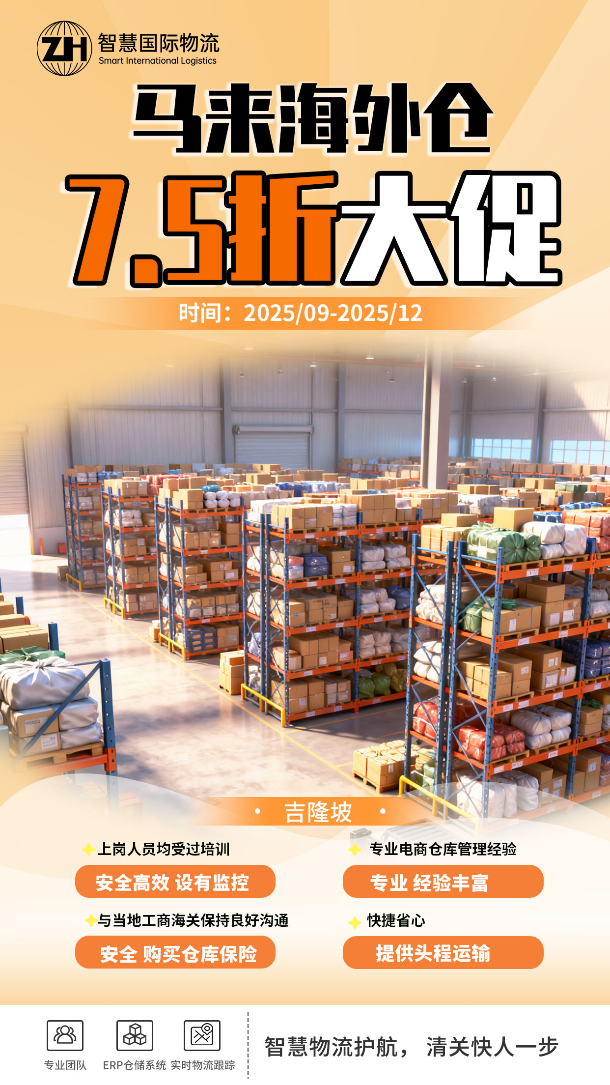[广东智慧物流] 吉隆坡讯 为助力广大跨境电商卖家全力迎战2025年末销售旺季,我们隆重推出“马来海外仓超级优惠季”活动!即日起至2025年12月31日,新老客户均可尊享全线服务费7.5折的巨大优惠,以顶尖的仓储物流解决方案,为您的业务增长保驾护航。