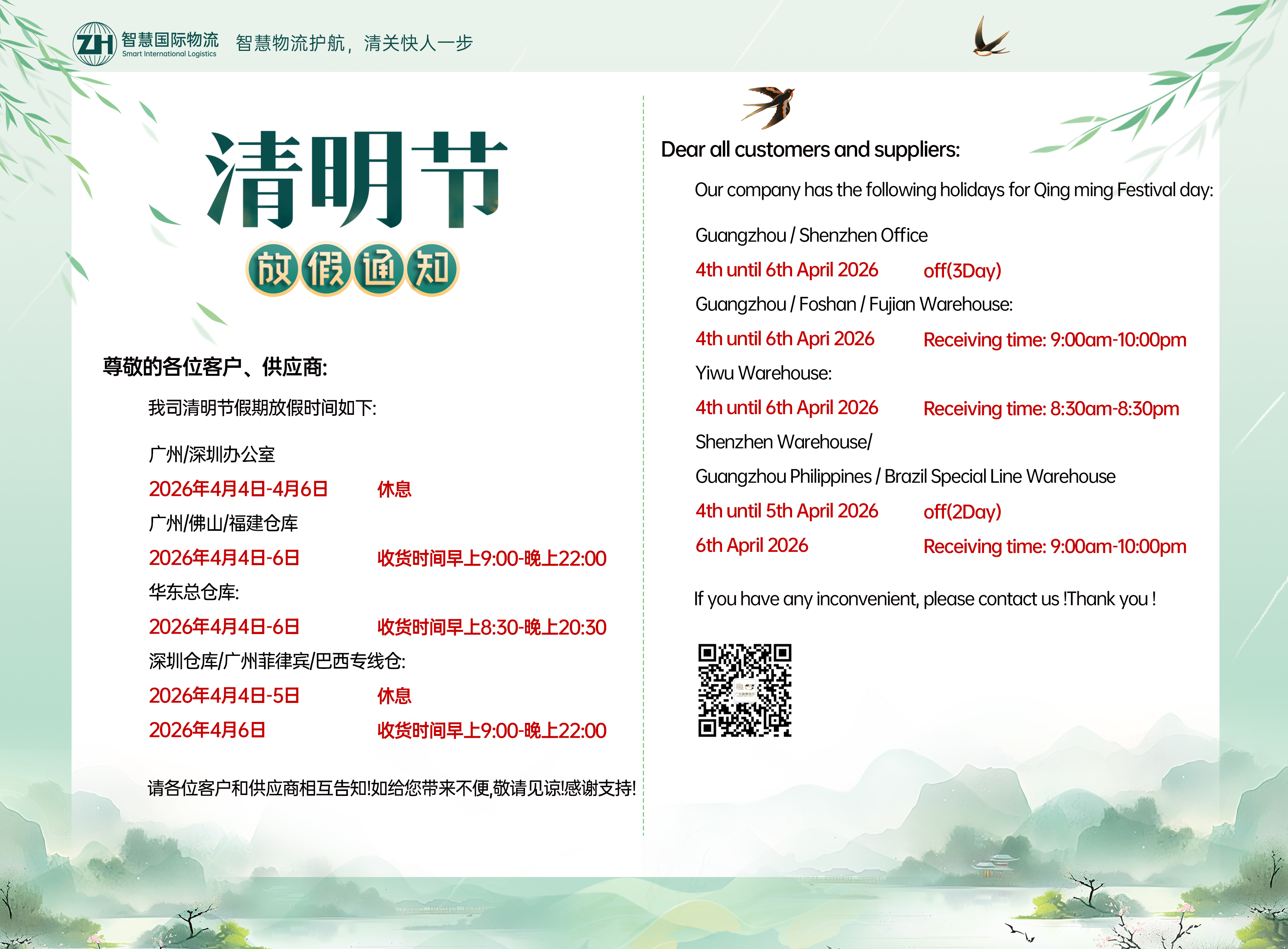 感谢您一直以来对我司的信任与支持!根据国家法定节假日规定,并结合我司实际运营情况,现将2026年清明节假期安排通知如下: