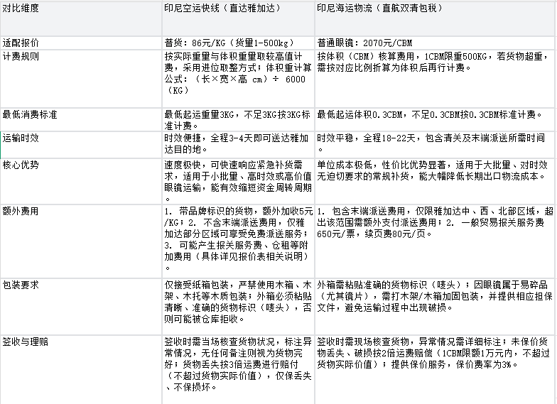 针对眼镜批量出口印尼的需求,结合印尼空运快线、印尼海运物流两份报价表,本文将全面拆解物流方案的选择逻辑、成本核算、操作规范及风险规避,为从业者提供可直接落地的实操指引,助力货物高效、合规、低成本送达印尼。