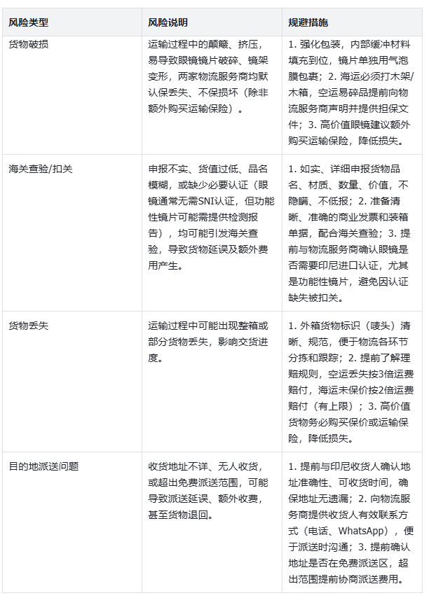 眼镜出口印尼途中,主要面临破损、清关查验、丢失、派送异常四大风险,具体规避方法如下: