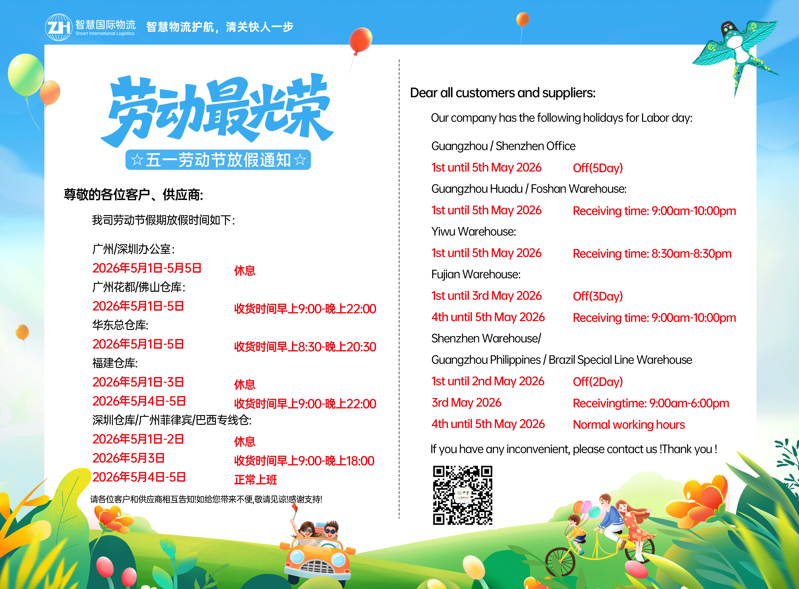 广东智慧国际物流2026年劳动节放假通知